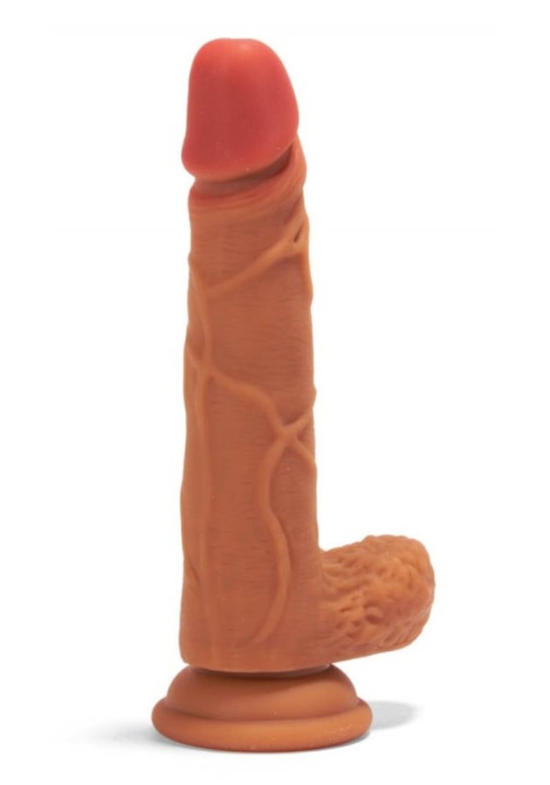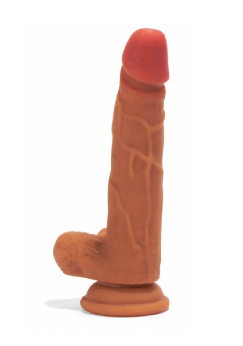 Péniszformájú,barna színű dildó, tapadótalppal, hangsúlyos makkal.