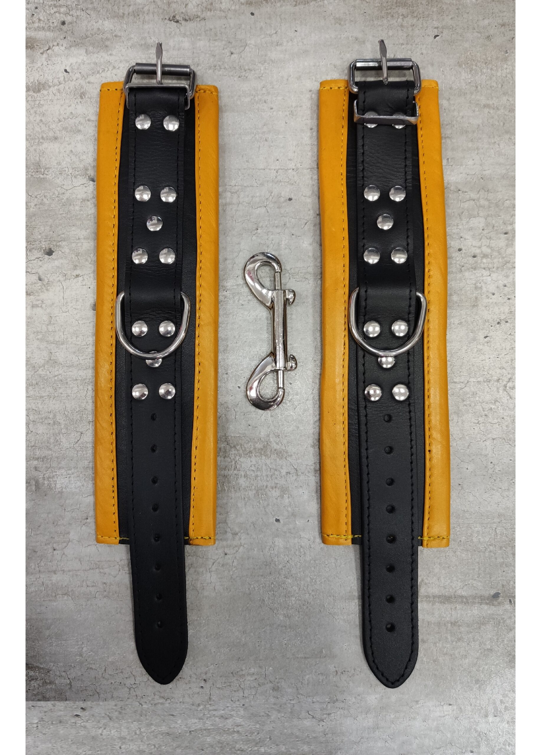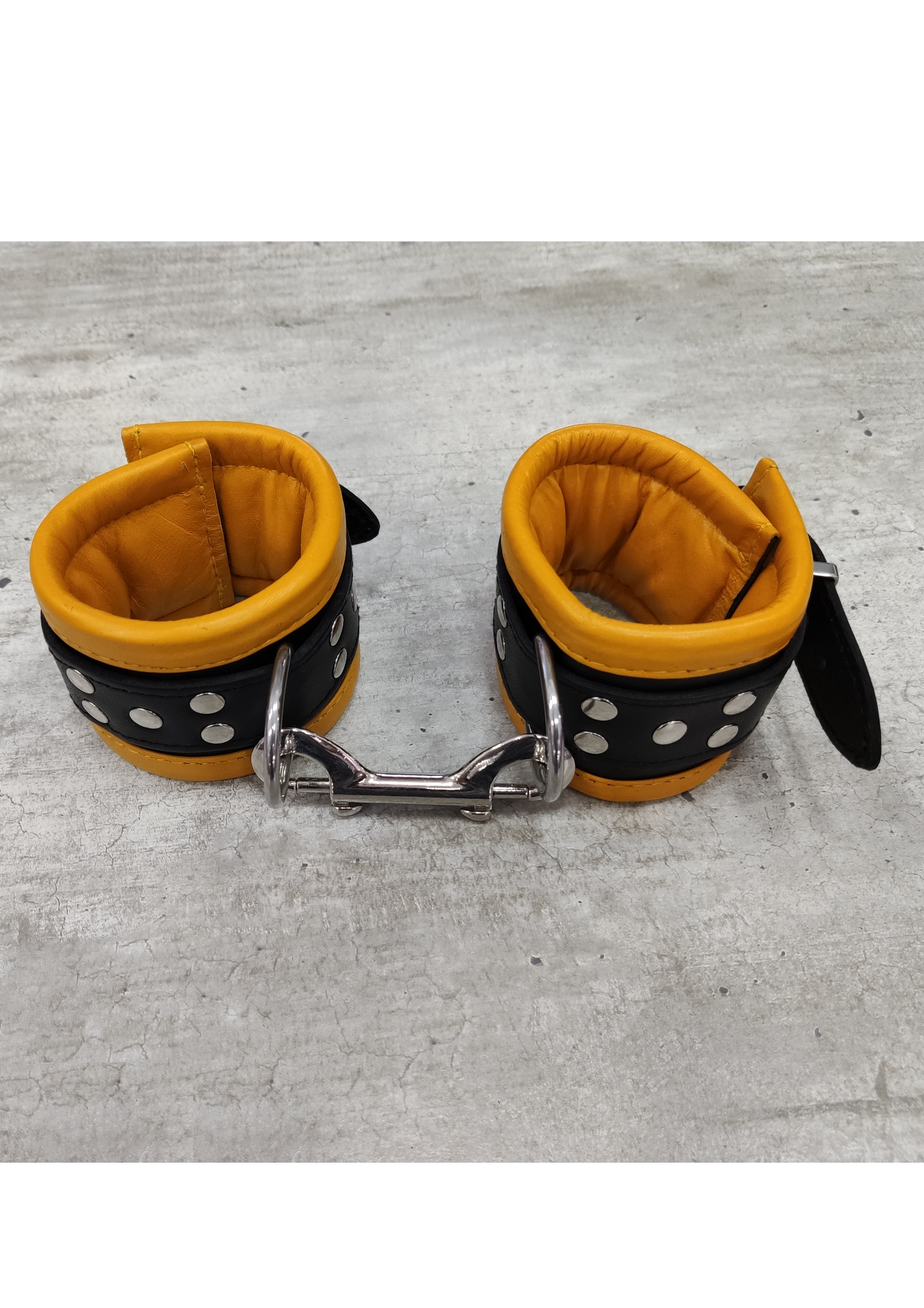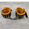 Bőr párnázott kézbilincs sárga/fekete.
