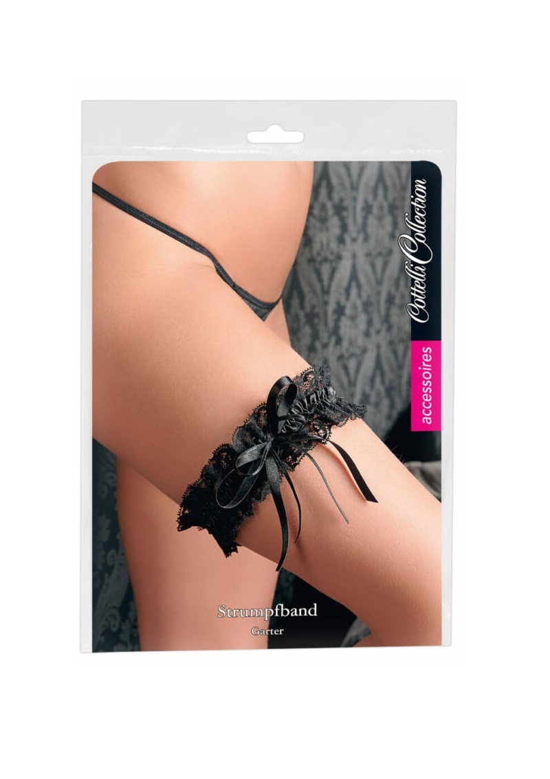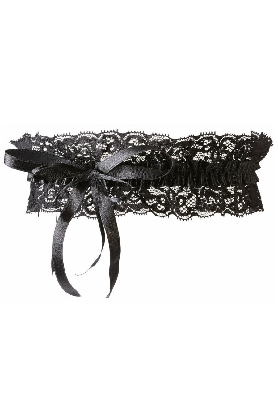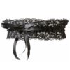 Puha, rugalmas csipkéből készült fodros harisnyakötő, a középen végigfutó, csillogó, fekete szatén szalaggal díszítve.