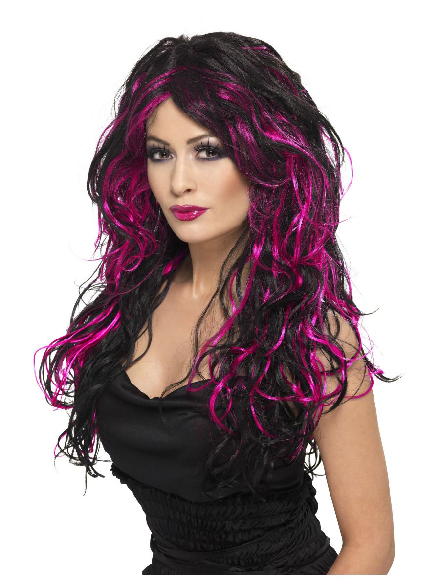 Gothic fekete-pink paróka. Gumis hajhálón.