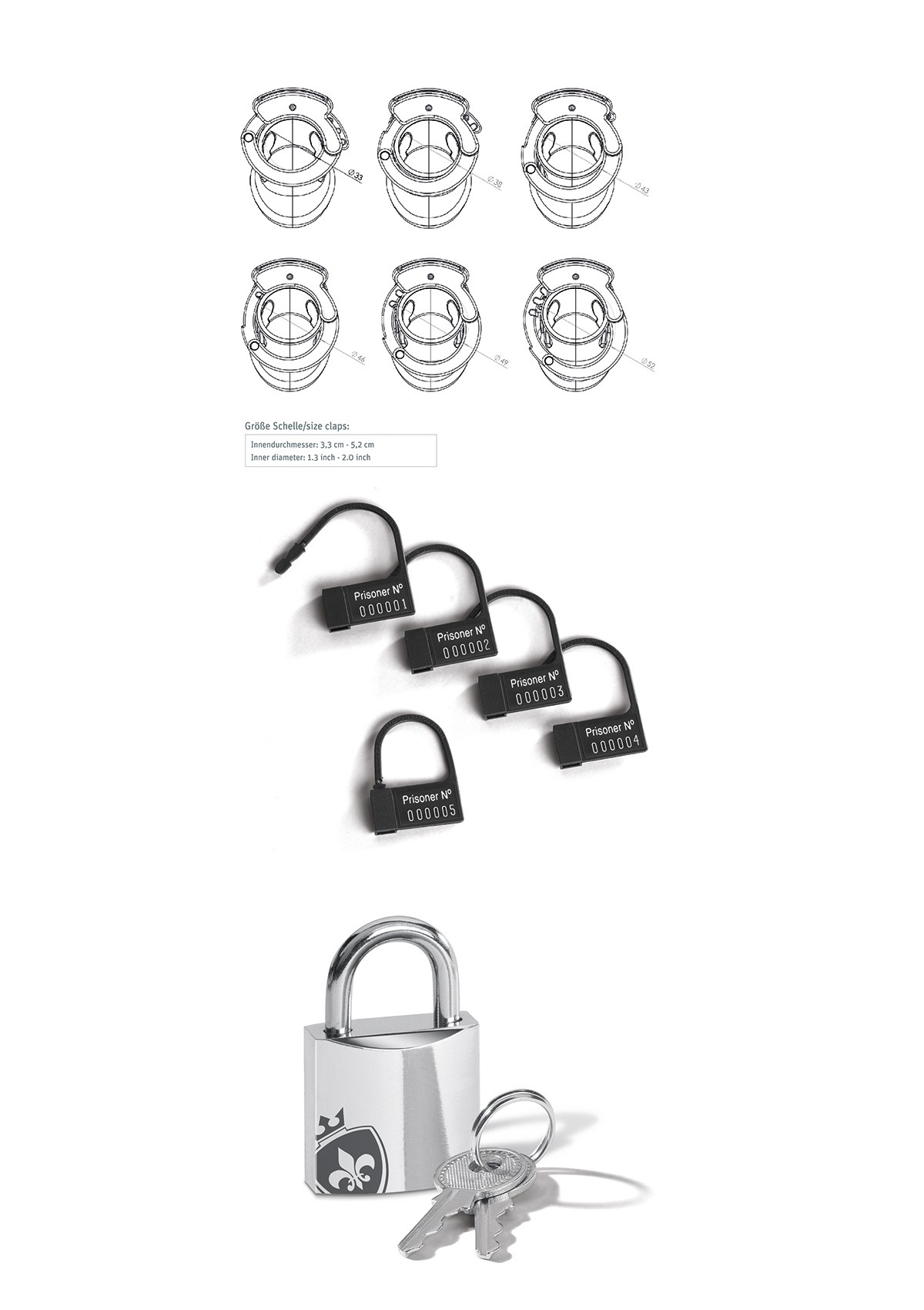 Nagyon puha szilikon részekkel ellátott, kiváló tartású, erős, áttetsző műanyagból és szilárd rögzítőlemezből (bilincsből) álló péniszketrec, fém lakattal, két kulccsal, három, különböző hosszúságú, áttetsző, műanyag távtartóval és egy kis szilikon húgycsőstimulálóval (kivehető).