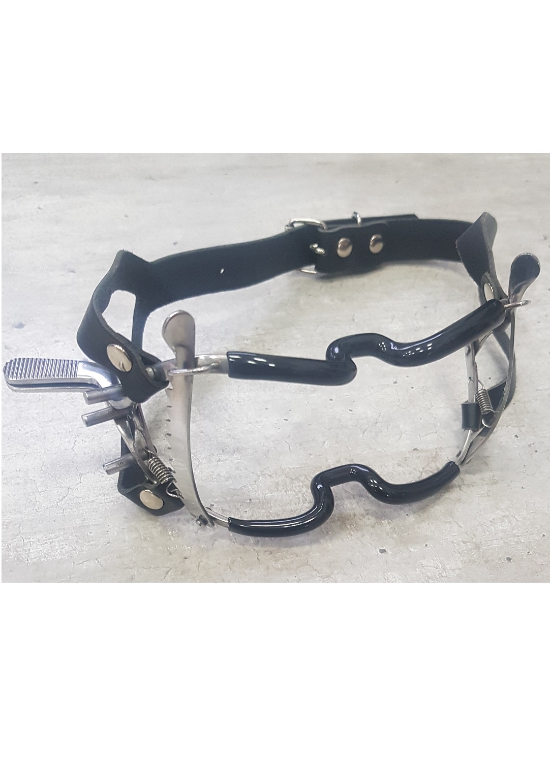 Rugós rozsdamentes acél szájpecek bőr pánttal.